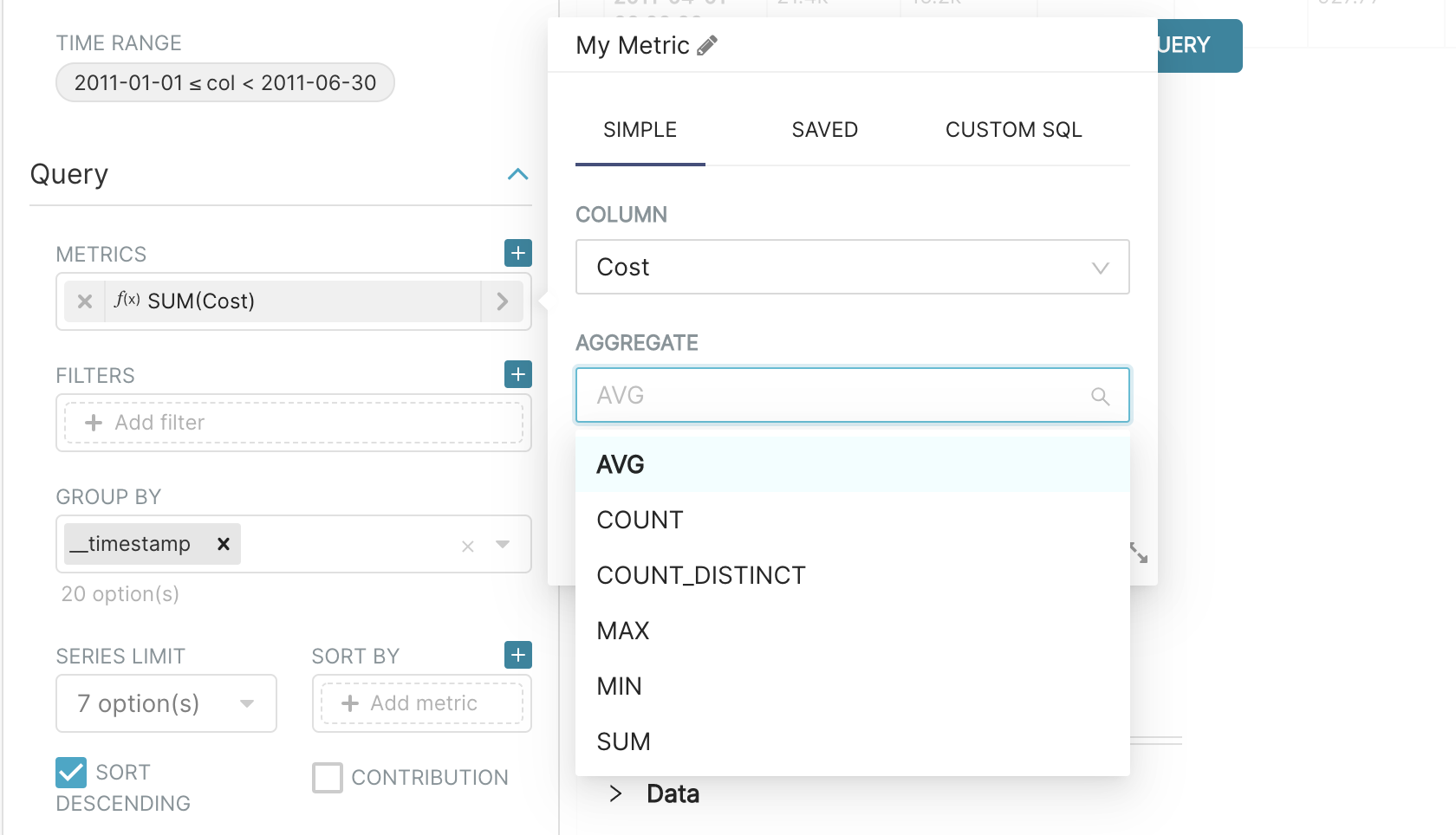 Next, within the Query section, remove the default COUNT(*) and add Cost, keeping the default SUM aggregate. Note that Apache Superset will indicate the type of the metric by the symbol on the left hand column of the list (ABC for string, # for number, a clock face for time, etc.).